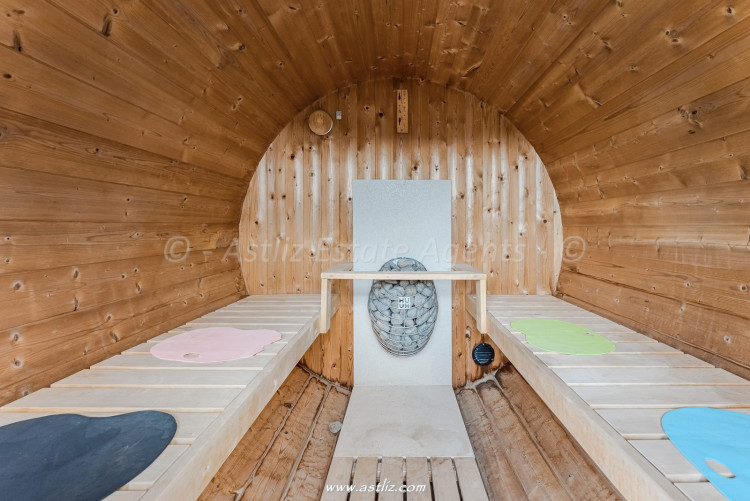 Outside, a large terrace becomes thetrue heart of the home, with a swimming pool, jacuzzi,sauna, chill-out area, barbecue, and outdoor dining area,perfect for relaxing or enjoying gatherings outdoors.